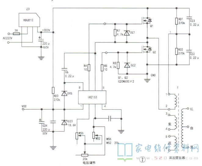 如果电路过压或过流,LM358①脚输出高电平,BT2(SS8050 )导通,IR2153①脚工作电压VCC被大幅拉低,IR2153停止工作。