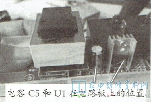 一台欧多尔ISD-S105型60升储罐式电热水器,不通电。上电观察,面板指示灯不亮。拆机目测,电源板上电解电容C5( 1000uF/25V)炸裂。在拆下C5时,发现此电容出厂时极性装反。用万用表的电阻挡在路测量,发现位于C5旁边的三端稳压器U1(7805)击穿,如图1所示。更换C5和U1后试机,故障排除。