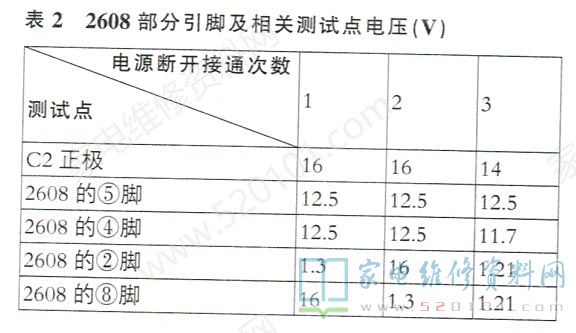 本机中2608的⑥脚接地,②、⑧脚分别接继电器K1、K2,故为两路三态输出方式:第一次闭合开关后,K1吸合,图2中的上部LED45-HL控制装置得电工作,图1右侧的LED控制装置工作,从左至右第2.4、6.8.10灯条亮。断开开关再闭合后,K1释放,K2吸合,图2中的下部LED45-HL控制装置得电工作,第1、3、5、7、9灯条亮。再次断开开关,K1吸合,K2保持吸合状态不变,图2中的上、下部LED45-HL控制装置均得电工作,10个灯条全亮。三种状态下2608部分引脚及相关测试点电压见表2。