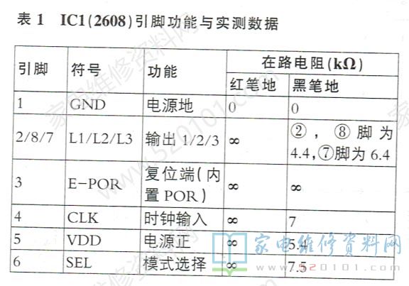 数码分段开关MDS-201由IC1(2608,估计为HM2608)、继电器K1、K2及降压电容C1等元件组成,功能是通过一个开关控制两组灯源,分段实现第一组灯亮、第 二组灯亮和两组全亮。2608采用CMOS工艺制造,具有低功耗和工作电压范围宽(VDD=3V~18V)等优点,并内置复位电路,具有模式选择端,可实现2或3路选择,其引脚功能和实测数据见表1。