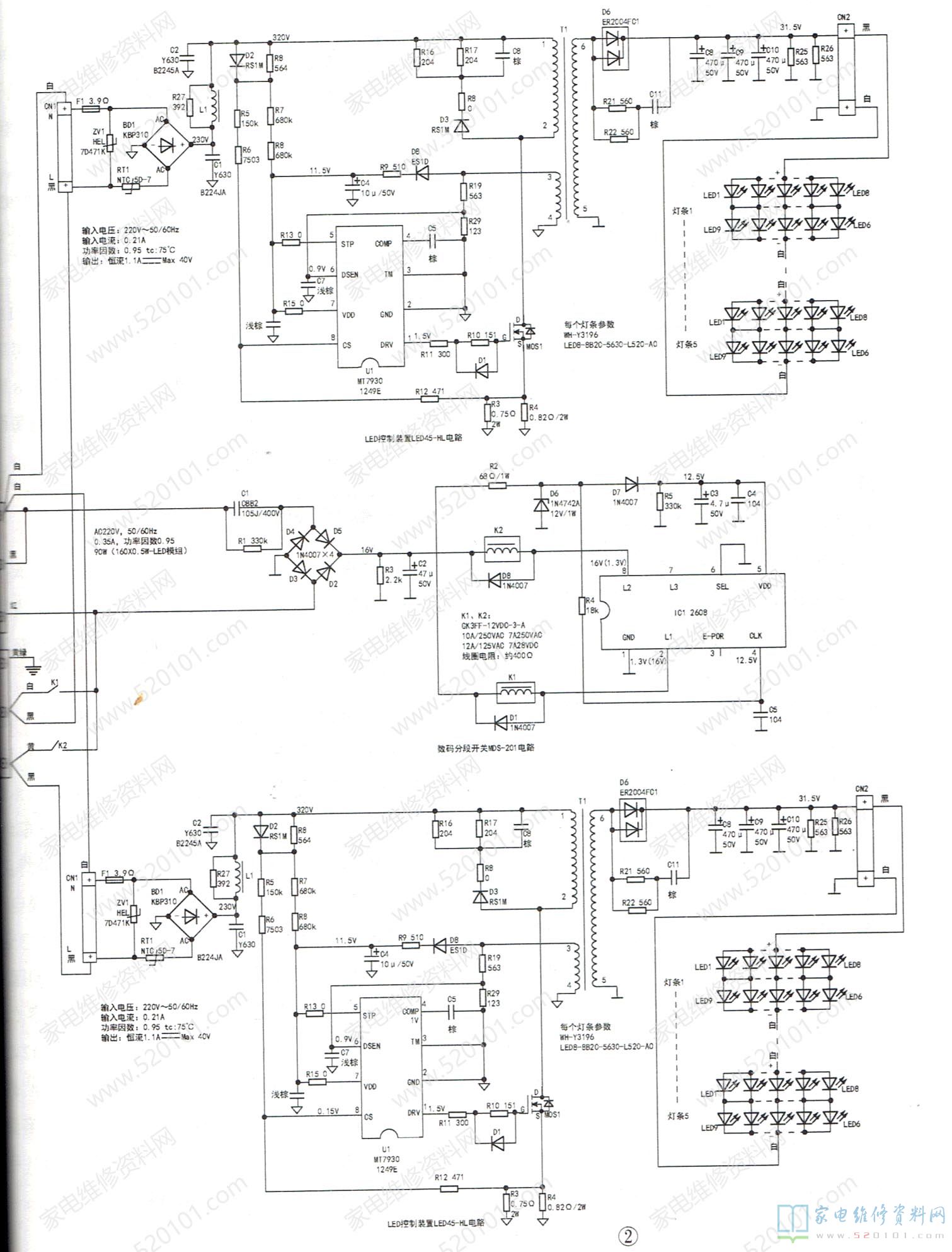 过电压保护:当MT7930的⑥脚电压连续高于3.2V,或者⑦脚电压连续三次超过19.2V时,芯片将关闭PWM开关信号,⑦脚电压降至UV-LO阀值,并进入重启模式。短路保护:MT7930的⑥脚电压在持续640us内均低于200mV,则启动短路保护功能,栅极驱动信号将停止。过流保护: -旦MT7930的⑧脚电压超过2.2V,芯片将立即关断功率MOS1管。LED控制装置LED45-HL的负载由5根LED灯条串联而成,每根灯条由两组各8颗LED串、并联而成。实测每颗LED管压降约3.15V,LED供电电压约31.5V。