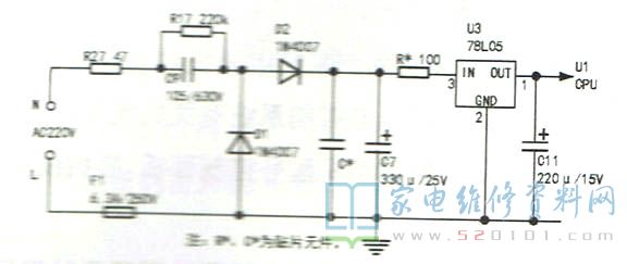 提示:该电源电路是典型的阻容降压电路,电路简单,多用在小家电中。实修中发现降压电容易出现容量减小,从而导致整流后的直流电压过低。