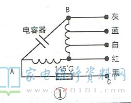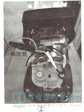一台式电风扇,通电后电机不转。首先用万用表检测定时器、按键开关均正常,电机转子转动自如。接下来测量电机线圈阻值,该电机的接线图如图1所示。测得红、黑线之间阻值无穷大,红、蓝线之间阻值为240Ω,电容两端的阻值为1270Ω。分析认为,故障原因是电机长时间工作过热,导致内部的145°C保险管开路。若要更换或短接保险管需要拆开电机,加之保险管埋在线圈的下面,操作较麻烦。若要更换电机,要等四五天。因顾客急用,决定不拆开电机,而在外部连接A、C两点。