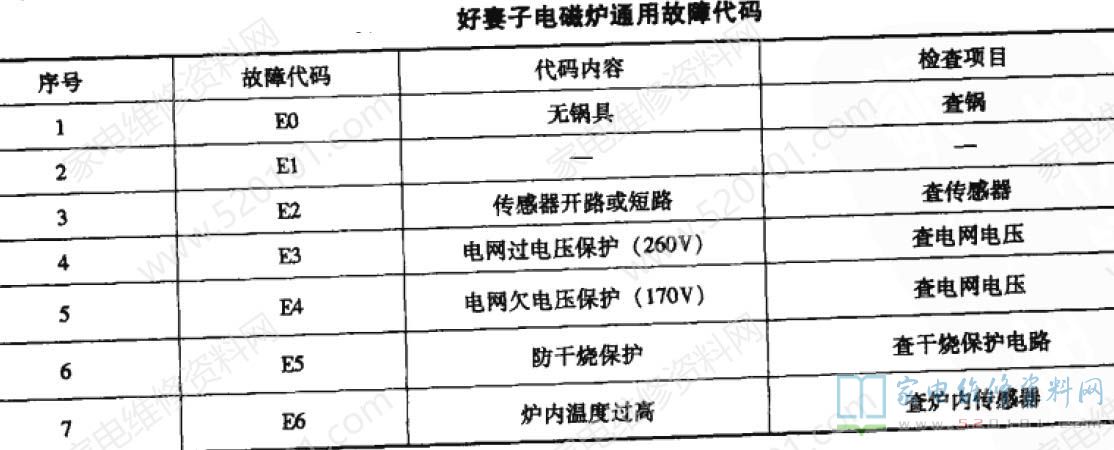 代码 原因 E1 锅局材质不对 E2 电压过高 E3 电压过低 E4 锅底温度过高 E5 功率管过温 E6 温度传感器短路或开路 E7 电路故障 ...
