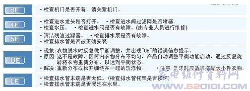 代码 故障原因 故障部位和解决方法 dE 门未关好 检查洗衣机门是否未关好 4E 进水异常 1.检查水龙头是否未打开:2检查水压是否不正常 5E 排水异常 1.清洁残渣过滤器;2、检查排水管是否未正确安装 UE ...