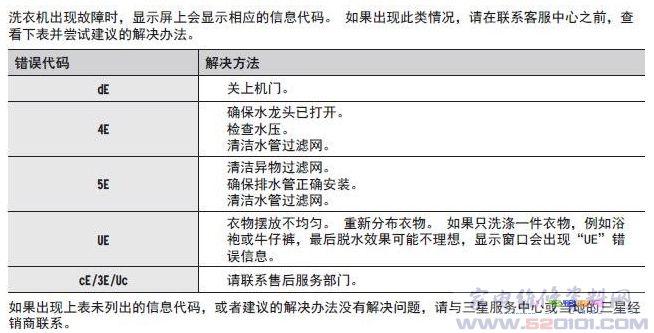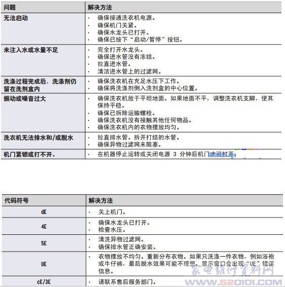 洗衣机无法启动 · 确定机门已经关妥。 · 确定洗衣机已接通电源。 · 确定水龙头已打开。 ·确定“启动/暂停”钮已按下。 不进水或供水不足 · 确保水龙头已打开。 · 确定进水管未被冻住。 · 确定进水管未弯曲。 · 确定进水管...