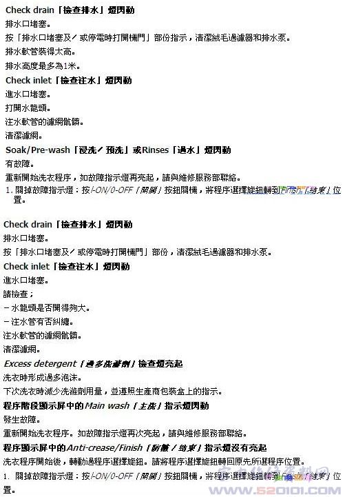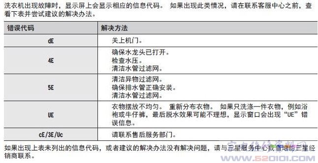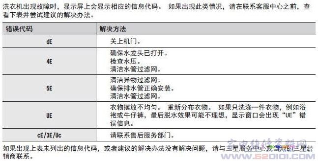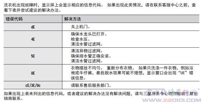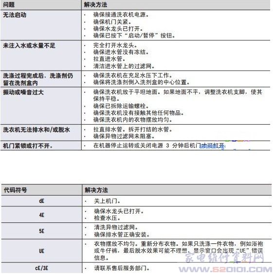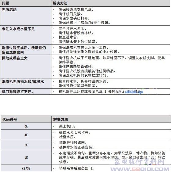 洗衣机无法启动 · 确定机门已经关妥。 · 确定洗衣机已接通电源。 · 确定水龙头已打开。 ·确定“启动/暂停”钮已按下。 不进水或供水不足 · 确保水龙头已打开。 · 确定进水管未被冻住。 · 确定进水管未弯曲。 · 确定进水管的过滤网...