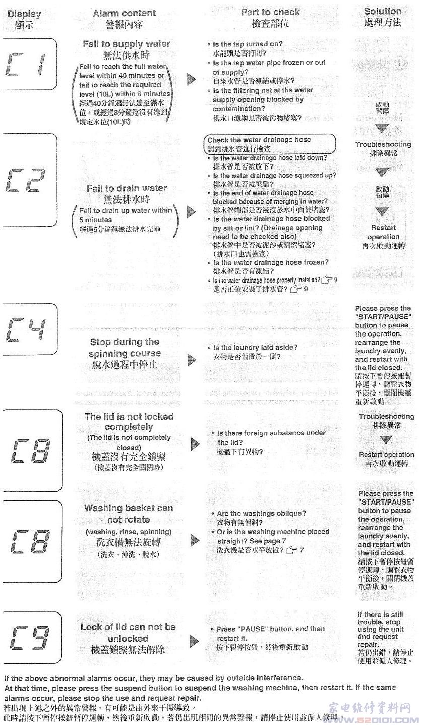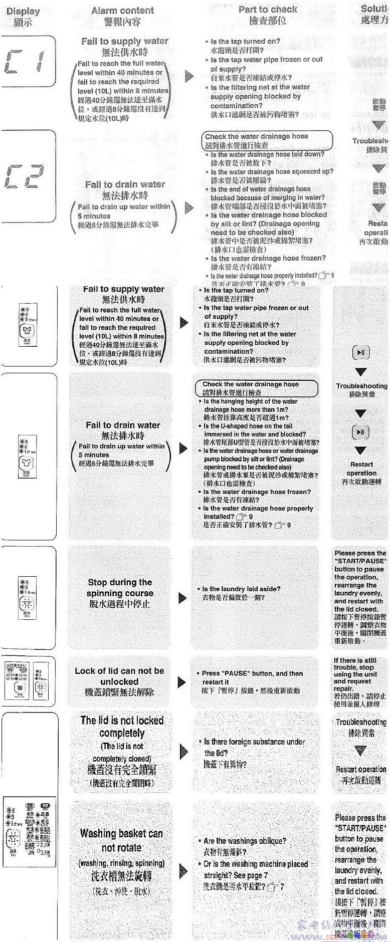 洗衣机无法启动 ·确定机门已经关妥。 ·确定洗衣机已接通电源。 ·确定水龙头已打开。 ·确定“启动/暂停”钮已按下。 不进水或供水不足 ·确保水龙头已打开。 ·确定进水管未被冻住。 · ...