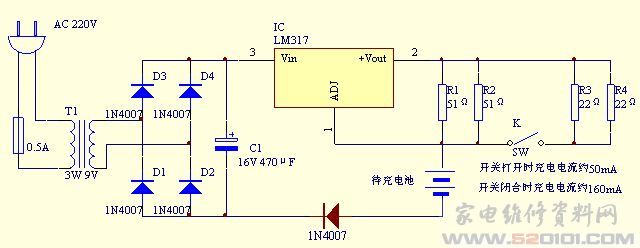 按图中的参数,开关打开时,充电电流约为50mA;闭合时约为160mA.这适合于普通的容量为500mA的镍镉电池.你可以通过改变接在LM317T的+Vout端与ADJ端的电阻阻值来改变充电电流的大小.其中,所需电阻阻值(单位为Ω)=1.25V/所需充电电流(单位为mA).