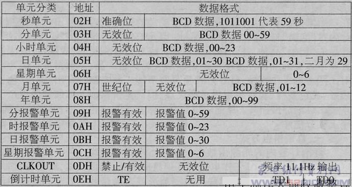 PCF8563是低功耗的CMOS实时时钟/日历芯片,提供1个可编程时钟输出、1个中断输出和掉电检测器,所有的地址和数据通过I2C总线接口串行传递。最大总线速度为400kbit/s,在数据交换时只要按照I2C总线模式进行操作,对时序的要求也不是太高。PCF8563内部寄存器地址与数据格式描述如附表所示。