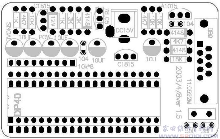 5:插入排阻(排阻有一个白点的一端是公共端,他的位置在靠近PCB边源的一端;电源插座,232插座就不用说了。
