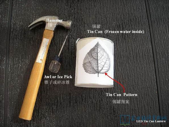 在网上找一些唯美或有趣的图案,亦或自己设计。你也可以在google上找一下”Tin Can Lantern”或者”Tin Can Light”来找一下灵感。我用的是两片树叶和一棵树的模型。至于锡罐,你可以在五金店随便买个油漆桶,或者其他你找得到的罐子,不过一个盖子还是必须的。