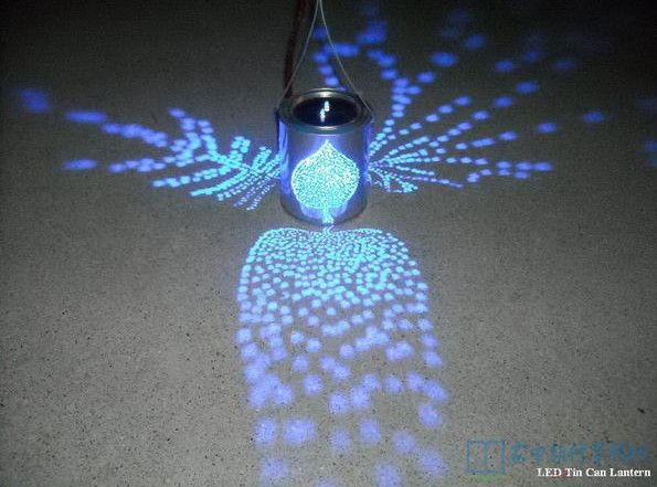 在一夸脱大小油漆罐上打出孔,蓝色的led灯光透过这些小孔照射出来,这样led的灯光可以清晰的投射出设计好的形状。至于说led投射出的图案,完全取决于你的取材或源自你独一无二的创造力。效果展示视频:https://v.youku.com/v_show/id_XNDU0Njc3MzEy.html