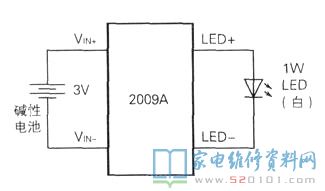 2009A是一种通用的小尺寸封装的功率LED驱动器,它能驱动一个1W大功率LED,也能驱动多个串接的φ5小功率LED,工作稳定并效率高。它内部是~个升压式电路,输入3V电压(两节碱性电池),最大输出可达8V:驱动器采用环氧树脂封装,使用安全可靠,可用于湿度大的地方;驱动器的输出相对恒定,电池电压很低时仍能使LED发光,延长电池寿命;尺寸小[(11.5mm(长)×7.6mm(宽)×6.6mm(高)],非常适用便携式灯具(手电筒、应急灯、矿灯等)。