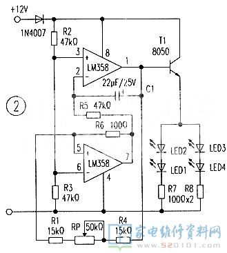 图1是国外电路网站给出的呼吸灯电路,该电路只有一颗LED灯作指示.往往在某些场合不明显。图2是根据图1进行的改进电路,可以增加到4只LED。