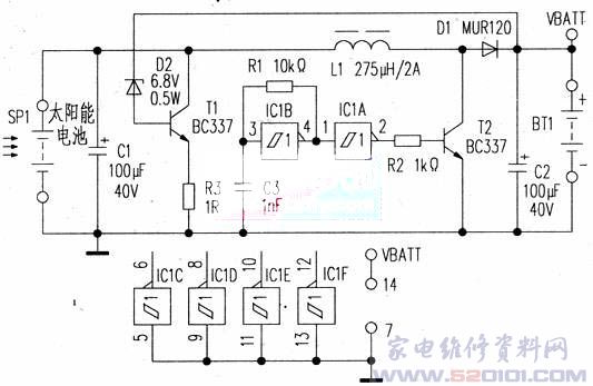 IC1A作缓冲器,使振荡器输出端得到一个较轻的恒定负载。起隔离作用,保证了频率稳定。IC1的电源可直接连到输出端充电电池上得到。T2起开关作用,控制太阳能电池对蓄电池的充电。当缓冲器IC1A输出高电平时.晶体管T2导通,集电极电流经过电感L1储存了磁场能量。并建立反向电压VL1(图中为左正右负),当缓冲器IC1A输出低电平时,晶体管T2截止,VL1的极性变反,与太阳能电池电压叠加,电流经电感L1、二极管D1流入负载(电容C2和蓄电池BT1),电容C2和电池BT1被充电,在稳定状态下输出电压将高于输入电压,当晶体管12再次导通后,过程重复。