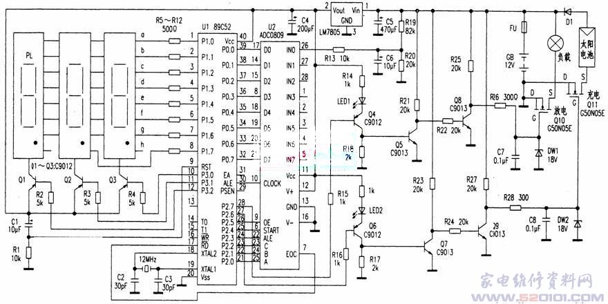 为了使软件编程简单、不用作运算,根据ADC0809能将0~5V电压转换成数字量0~255的原理。假设太阳能电池对铅酸蓄电池充电和铅酸蓄电池对负载放电过程中,铅酸蓄电池的端电压变化范围是0~25.5V,经过电阻R19、R20串联分压后,在R20的两端得到≤5.0V的电庄,又经过A/D转换变为数字量0~255,送到89C52控制处理后,并转由1ED数码管显示数字量0~25.5,刚好能使电压变化范围值与数字变化量相对应。显示的数字量就是实际电压值。例如显示12.0,就可以读作12.0V。