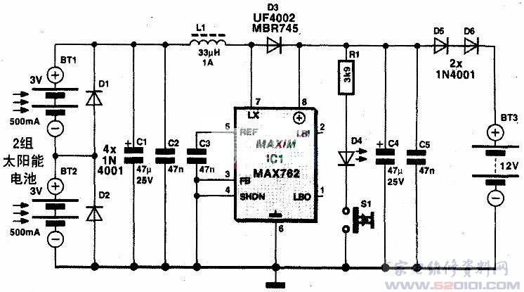 下图的电路可以防止这种情况的发生。2组3V的太阳能电池板分别连接了二极管,当它们不产生电能时被二级管旁路,它们要供电MAX762升压变换器IC1。