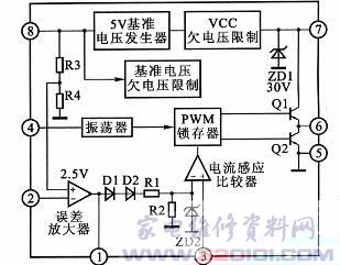 内设过流保护输入(第3脚)和误差放大输入(第1脚)两个脉冲调制(PWM)控制端。误差放大器输入端构成主脉宽调制(PWM)控制系统,过流检测输入可对脉冲进行逐个控制,直接控制每个周期的脉宽,使输出电压调整率达到0.01%/V。如果第3脚电压大于1V或第1脚电压小于1V,脉宽调制比较器输出高电平使锁存器复位,直到下一个脉冲到来时才重新置位。如果利用第1、3脚的电平关系,在外电路控制锁存器的开/闭,使锁存器每个周期只输出一次触发脉冲,无疑使电路的抗干扰性增强,开关管不会误触发,可靠性将得以提高。