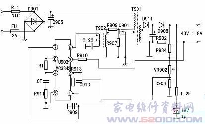 第4脚外接振荡器定时元件,CT为2200pF,RT为27kΩ,R911为10Ω。该例中考虑到高频磁芯购买困难,将频率设定为30kHz左右。R911用于外同步,该电路中可不用。