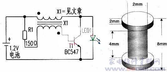 工作过程:电路接通电源后,电池经R1和变压器X1的下方绕组使T1基极一发射极通电.晶体管T1因X1绕组的正反馈而很快导通。导通期间LED1不发光。T1导通后趋于稳态,这时X1两个绕组的交流阻抗消失,直流电阻几乎为0。这时集电极一发射极电压也几乎为0,其基极电压低于T1导通门限电压0.6V.于是T1截止。截止后LED1因X1绕组中的储能而导通发光。在LED1发光期间,X1绕组又有电流流通.流通后T1再次因X1的正反馈导通,如此周而复始产生间歇振荡。振荡期间,T1导通时X1积蓄电能,LED1不发光。T1截止时储能泄放使LED1发光,镍镉电池得以放电,电池电压随着放电的进行也逐渐减小。当电池电压放电至0.6V时.LED1就不再发光,电池放电过程结束。