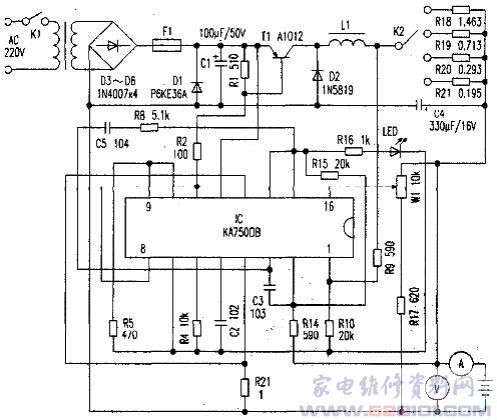 电路如附图所示:此锂电池充电板原用于汽车电源给手机7.2V锂电池充电,其充电过程是先恒流充电,再恒压缓充,最后恒压浮充。根据其原理,再增加电源变压器、整流滤波电路、电阻R17~R21、W1、电压表、电流表等元件,使之成为一款输出电压在DC2V~DC15V,输出电流在100mA、200mA、500mA、1.5A四挡可变的充电器。