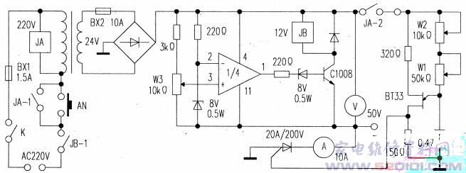 电瓶的安全充电电流一般为容量的1/20。如36Ah电瓶充电电流为1.8A左右。为了使充电器具有通用性,变压器的功率最好选大一点.输出电压高一些,我选择次级输出10A/24V变压器,可以给150Ah以下电瓶进行充电。整流用20A/200V硅堆,单向可控硅为20A/200V。JA继电器的触点电流大于10A,JB继电器及按钮的触点电流要大于5A。集成电路电路用LM324比LM741好一些,市场上74l的正品买不到。次品输出⑥脚不动作时有1.3V左右的电压。电阻用1/2W,其他如图所示,没有特殊要求。