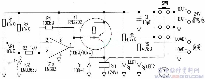如使用驱动能力低的比较器(如LM393或运放LM358等)不能直接驱动继电器时.可在比较器后加一驱动级。驱动级采用内藏电阻的大功率三极管RN2202。电路如图3。图3例举了24V蓄电池.此时VR1调整的终止电压值应为20V。