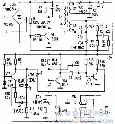 充电器的电源属于开关电源,市电经VD1~VD4整流。输出180V脉动直流电压,通过L1加到VT1集电极,启动电阻R1激励VT1振荡。由于L3感应电压的正反馈使VT1继续工作,L2的感应电压经VD6整流、C2滤波、R3限流,输出+9V的直流电压。
