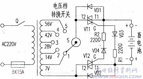 综上所述:不论是电池正极、负极输出,(+、-)、(-、+)端连接均能正常充电。如果蓄电池剩余电压过小不能触发VT1或VT2导通,就不能进行充电。对于这种情况,可用晶体管代替VD3和VD4来减小晶闸管的触发电压。而对于VT1、VT2和VD1、VD2器件的要求耐压大于100V、连续工作电流为20A以上。VD3、VD4只需耐压大于50V、工作电流100mA左右就行了。具体情况根据蓄电池的电压及充电电流实际需要而确定,灵活掌握选用这些电子元器件。