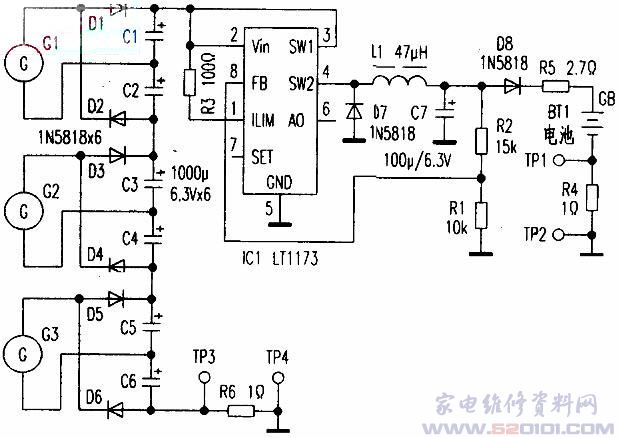 当风速为1m/s时。风叶开始转动,充电开始,电流约40mA;当电池快充满时,充电电流减小,所以长时间充电也不会损坏电池;而在强风时,电池也不会发热。以上介绍的风力发电装置已达到实用水平,但增加发电机数或选用更大功率的发电机,可以扩大其应用范围。