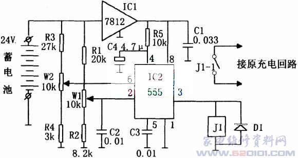该电路由取样电路、双稳电路IC2、继电器J1等组成。其中取样电路分为上限和下限取样电路。由电压网络R3、W2、R4组成的上限取样电路接IC2(555)双稳态电路⑥脚,由电压网络R1、W1、R2组成的下限取样电路接IC2的触发端②脚。当蓄电池电压使②脚电位低于1/3VDD时,555发生置位,③脚输出的高电平使J1吸合,触点J1-1接通,充电回路开始充电。当蓄电池电压充到足够高,使IC2⑥脚电位高于2/3VDD时,555发生复位,③脚输出的低电平使继电器J1释放,触点J1-1断开,充电回路停止充电,从而使蓄电池电压保持在一定的电压范围。