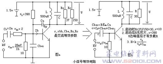 有多种分析方法,为了简化计算,仅分析小信号放大的情形,这也是起振的关键。小信号时,我们可把三极管、二极管等效为线性元件,之后即可用拉氏变换或复数法等方法进行计算。拉氏变换可得到详细的暂态过程,然而本电路在小信号时的暂态过程不是我们所急需的,使用此法有点吃力不讨好。因此建议使用复数法求出稳态情况即可。顺便说一下,使用电子仿值软件(如EWB9.0)也可得到暂态和稳态过程,但仿真软件是基于数值计算的,可轻松得到计算结果,却不易找到各元件参数的相互关系。
