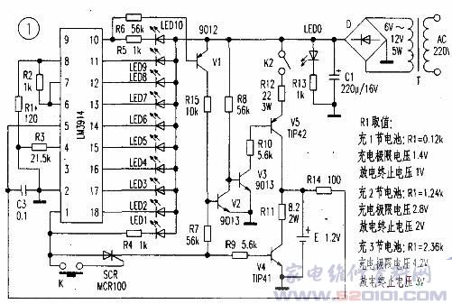 本充电电路具有放电功能,放电完毕自动转入充电状态,充至约90%后自动进入小电流续充至满。兼有电池电量指示功能,LED1~LED10指示的电压值见附表。