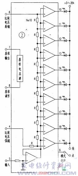 LM3914是电平、电压LED显示驱动集成电路,可工作于点/线显示状态,其内部框图如图2所示。LM3914内包含有一个可调基准电压源和10个电压比较器,10个1kΩ的精密电阻串联组成分压器,分别向各电压比较器提供比较基准。可通过外部电路向第⑥脚(电阻分压器高输入端)和第④脚(电阻分压器低输入端)提供所需基准电压。电阻分压器将⑥、④脚间电压均分为十段,与输入电压进行比较,相应的电压比较器便输出低电平(点显示状态时;若置于条显示状态,则低于输人电压的比较器均输出低电平),驱动对应的LED发光。内含的可调基准电压源由⑧脚调节,⑦脚输出。图1中,⑦、⑧脚外接电阻R1l、R2可控制基准电压源输出端⑦脚的电压,其值=1.25(1+Rl/R2)。本充、放电路利用其基准电压源输出的电压,作为控制充电的终止电压,其值为1.25(1+120/1000)=L4V。由④脚的外接电阻R3控制①脚LED1的点亮启动电压,即放电的终止电压,其值=1.4(21.5+1)/(10+21.5)=1lV。印刷板如图3所示。为了便于自制,三极管全部用TO-220封装形式设计。