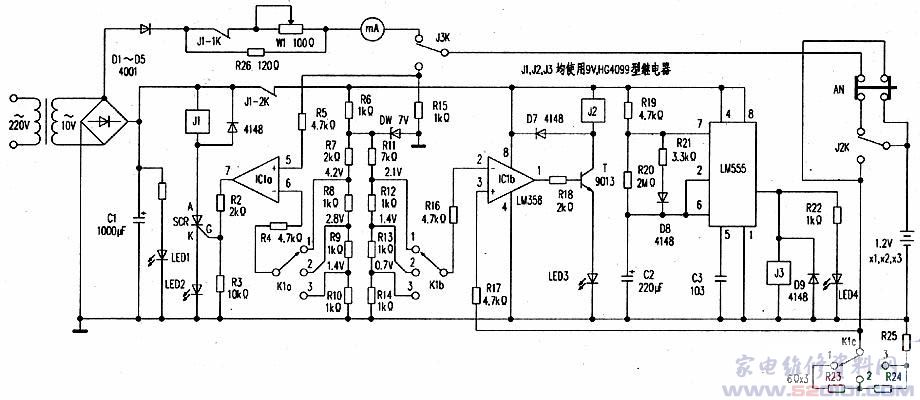 充电时IC2带动继电器J3使电路每15分钟对电池电压进行一次检测,当监测到此电压高于⑥脚预置电压时,说明电池已经充足,IC1a便输出高电平触发单向可控硅SCR,使J1吸合,J1的一对常闭触点同时分离,切断充电回路及控制部分电源,充电便告结束。但有约20mA的电流流经R26使电池维持涓流充电。为了给不同节数的电池组进行充电,用三刀三位开关给IC1预置了多个比较电压及切换相应的放电电阻。当开关置“1”位时可充三节的电池组.置“2”位时可充2节的电池组,充1节电池时开关应置“3”位。同时转动W1,将充电电流控制在合适范围内。
