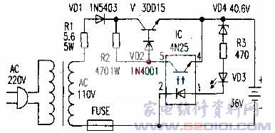 充电时,由于R2、VD2为调整管V提供基极偏置,因此V被导通后开始为电瓶充电。随着充电时间的延长,电瓶的端电压渐渐升高,到充满的电压值时,将击穿稳压管VD4回路,VD3点亮;同时光电耦合器IC触发导通。此时由于IC输出管导通后的导通饱合压降很低,相当于将V基一发射极短路,于是V截止,停止向电瓶充电,从而保护电瓶不会因过充而损坏。电路中VD4串入偏置的作用是为了使IC导通后的饱合压降明显低于调整管V的偏置压降值,从而使V此时能可靠截止。制作时,调整管V应加装散热器。