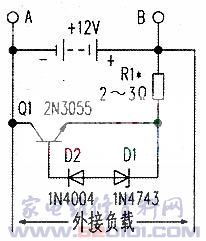 电路外接充电器充电时,如充电器的最高输出电压≤14.2-14.4V,在充电初期+12V蓄电池按常规的欠压(10.5V)状态慢慢上升,当电池电压达到稳压管D1的击穿电压(十13.5V)以上时,D1管开始导通,此时Q1管也导通,促使A、B端电压下降,按图中电路参数,A、B端电压最高值不会大于14.4V。在蓄电池已充满时保护电路会使蓄电池处于涡流充电状态,这就使电池得到充电保护功能。