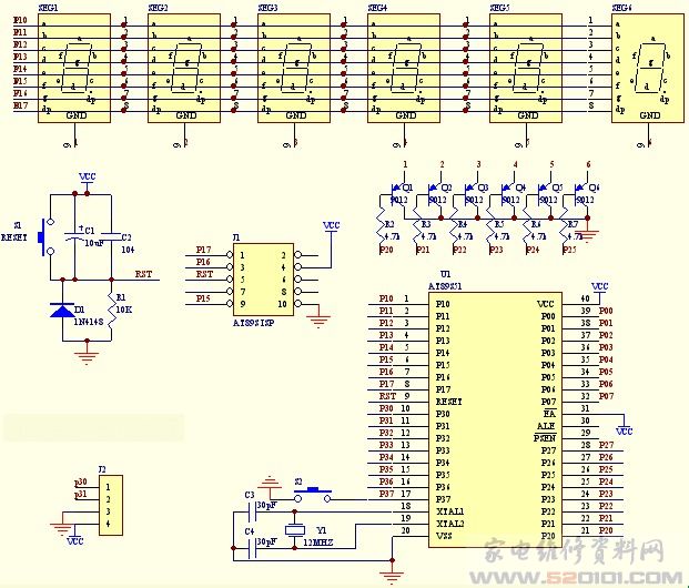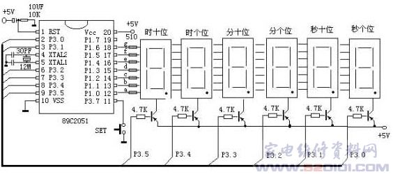 采用AT89C2051的6位电子钟原理如下图所示,只要硬件连接无误,保证成功。另外图中的SET按纽用于校准时间。按住2秒以上进入校准时间状态及换档和退出,快速点触用于调节时间数值。三极管采用9015即可。数码管最好采用红色的共阳型LED数码管,亮度高些,因为是扫描的显示方式,所以各个数码...