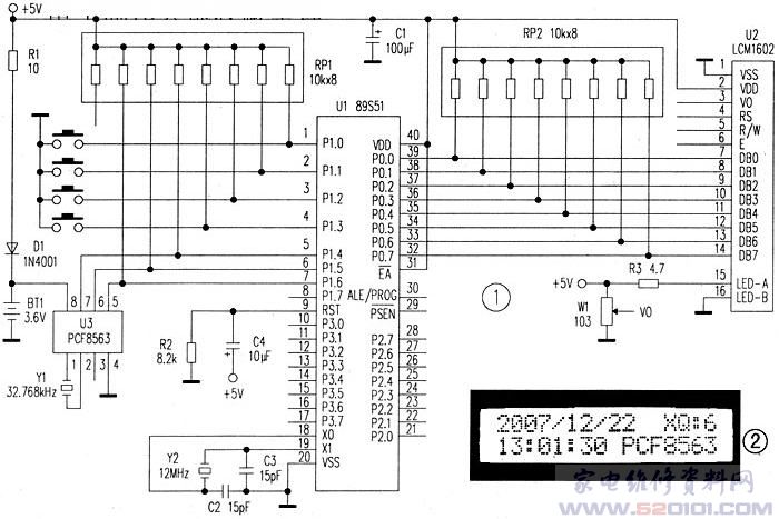 万年历时钟芯片很多,笔者认为,比起DSl302来说,采用飞利浦公司的PCF8563时钟芯片,LCM1602作显示,可以取得较理想的效果。电路图如图1所示。PCF8563是低功耗的CMOS实时时钟...