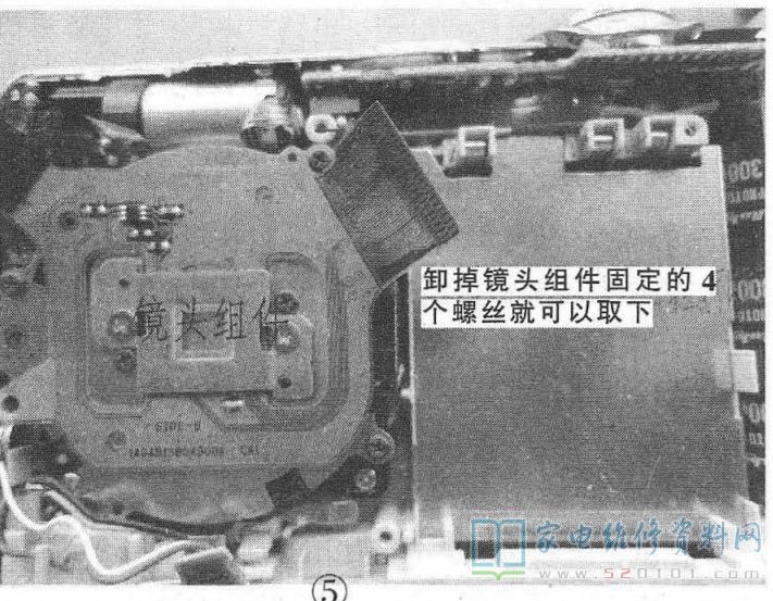 4.外电路板取下后,拆开镜头组件固定的四颗螺丝,就可以取下镜头组件了,如图5所示。