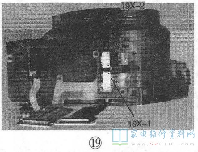 2.如图19所示,在镜头的侧面将两组排线19X-1、19X-2从对应的卡线槽中分离出来,然后将镜头的后座提起翻开,至如图20所示状态。此时,镜头的驱动齿轮组与镜头筒分离了,镜头筒的伸缩可以人工手动变换,便于取出镜头筒内部的各个部件。