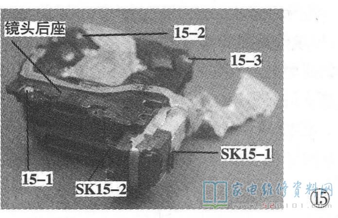 如图15所示,拧下固定钉15-1、15-2、15-3,轻微卸开镜头后座塑扣机构SK15-1、SK15-2,轻缓向上提起镜头后座并向右侧翻起,至如图16所示状态。