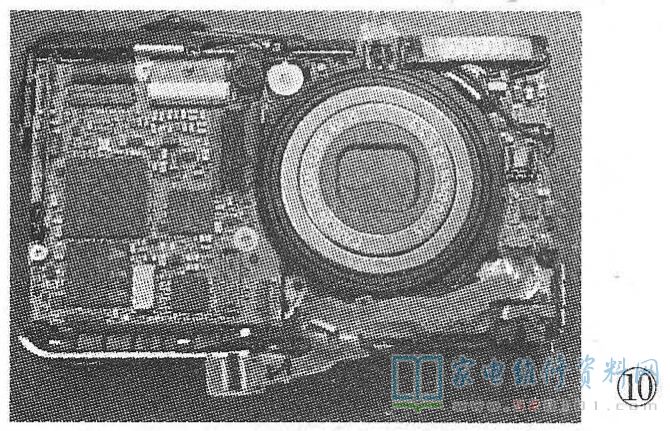 再看如图 9所示,将排线PX9-1、PX9-2从对应的卡线槽中分离出来,同时将处于镜头顶部闪光灯发光管边上的二极管向上挑起, 使其与镜头分离,至如图10所示状态。