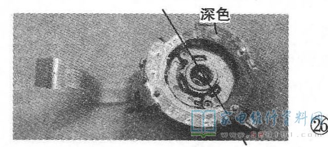 如图32所示是步进电机的局部图。常见摔坏的相机中,步进电机轴上的白色套轴移动块歪斜卡在步进电机轴上,致使步进电机转不动,对焦镜片组无法运动,此时,镜头往往卡住,不能收回,相机虽然能开机,但总是在几秒后保护停机。这种故障,如果这些件没有断裂,那么大多只需要将部件拆下后重新校正装配即可。