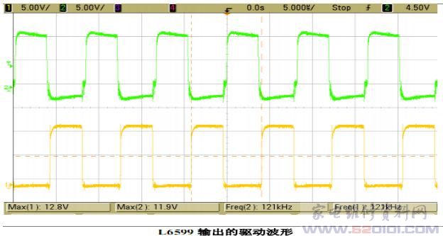 12脚加上电压后,给1脚(CSS)外接电容 C27充电,此时 C13可视为短路,R57与 R61并联,电阻减少,L6599 的振荡频率升高,电源功率下降, 当 C27充满电时,此时 C27可视为开路,振荡频率由R57决定,振荡频率降低,电源输出正常,由此实现变频软启动功能。同时,VDC通过R7、R8、R9串联电阻及 R45分压输入 7脚(Line),R45上并联的电容用来旁路噪声干扰。 7脚(Line)电压低于 1.25V 关闭 IC,高于 1.25V 低于 6V 时,IC 正常工作,通过对 VDC 的电压检测,实现欠压保护功能。IC完成软启动后,内部振荡器开始振荡,在 15脚(HVG) 与11脚(LVG)输出如图所示的两个占空比接近50%的脉冲, 驱动 MOS管开始工作。