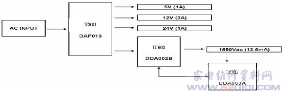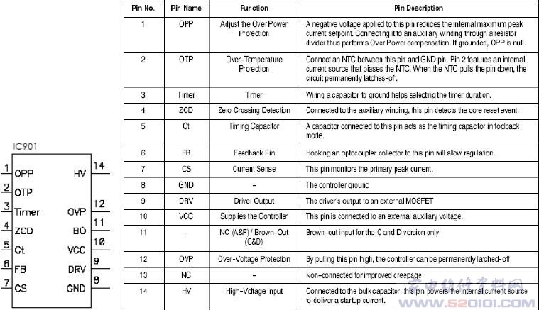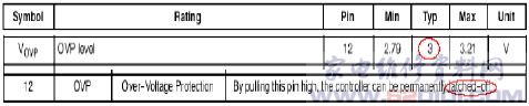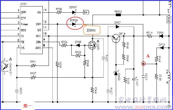 1)、OVP(Over Voltage Protection)过压保护: 当DC负载异常时,直流输出电压会冲高,造成如图一中A处电压也跟着冲高,ZD904导通使IC901的第12脚电压超过3V时,IC901发生Latch off保护。