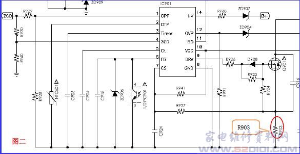 2)、OPC(Over Current Protection)过流保护: DC负载异常或输出端短路时,次级侧流过比较大的电流,同时使初级侧也流过较大的电流,较大的电流在R903上产生较大的压降,当此电压超过IC901内部的0.8V准位时,IC901发生Latch保护。如图二所示: