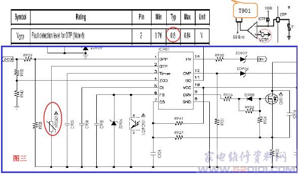 3)、OTP(Over Temperature Protection)过温保护: NTC601用导热硅胶贴在Mos管的散热片上,当MOS管流过大电流导致发热且散热不良或者产品工作的环境温度过高时,IC901第3脚接的NTC601的阻值会不断下降,使第3脚的电压也跟着下降。当IC901第3脚的电压低于IC901内部保护准位VOTP=0.8V时,IC901发生Latches off保护。如图三所示: