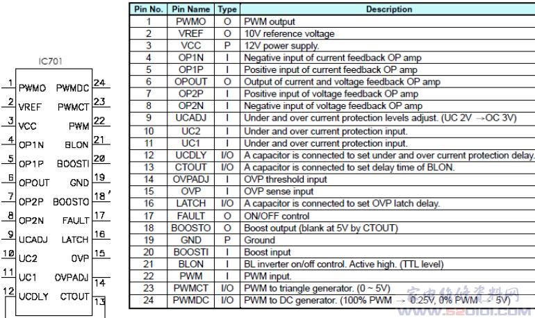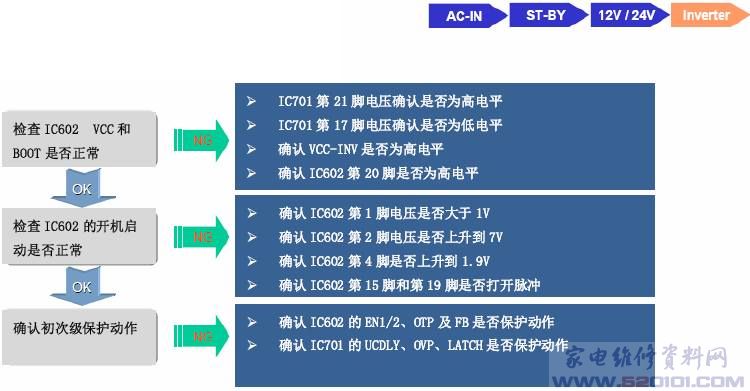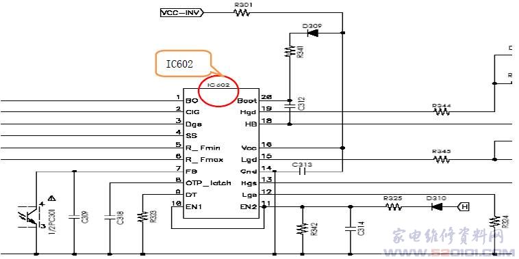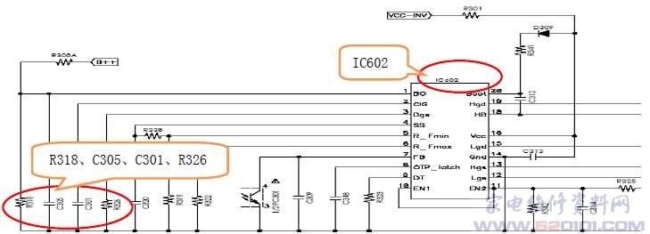 6、Inverter不良维修实例: 故障现象:Inverter无输出 检修方法:通电后电源部分正常,给出BL_ON信号后Inverter无输出。首先测量IC602的BO脚和VCC脚正常(BO脚应大于1V,VCC应为15V),如果这两个电压值都正常,再去量ICG脚。检查通电后ICG脚是否能充电到7V,且ICG脚充电到7V后,SS脚会充电到2V,当发现哪个脚有异常,就检查外围电阻或电容是否有异常。 故障原因:IC602未启动 原理图分析: